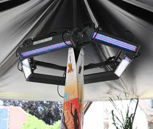 LED Lichterkranz: Unsere Bar ist mit 6 LED Leisten a 80 Lichtern ausgestattet, die sich per Fernbediehnung in verschiedene Farben steuern lassen. |